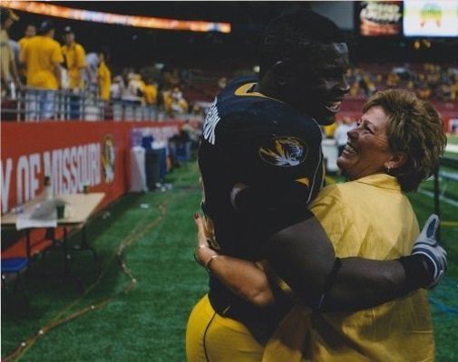 Article picture, Coach Thompson hugging Mizzou Football Player
